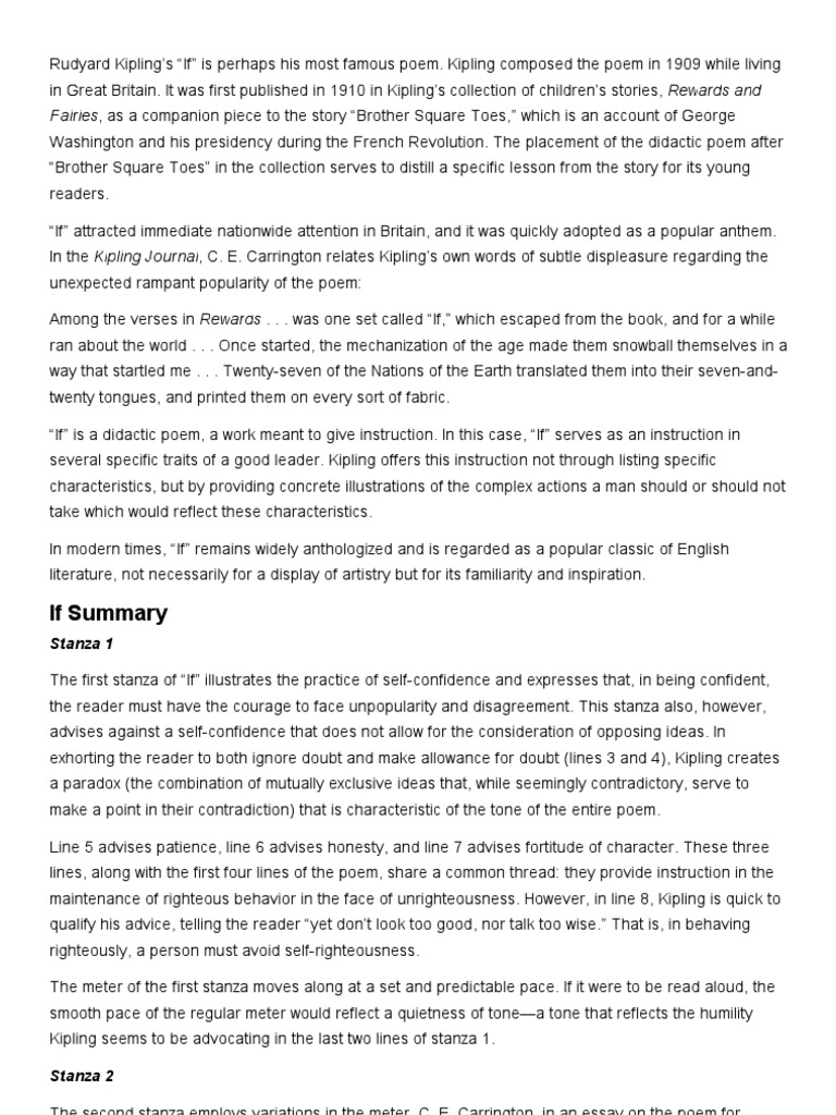 It was first published in 1910 in the chapter Brother Square Toes of the book Rewards and Fairies which. Among the verses in Rewards was one set called If- which escaped from the book and for a while ran about the. The poem If by Rudyard Kipling is a bundle of suggestions from father to his son.